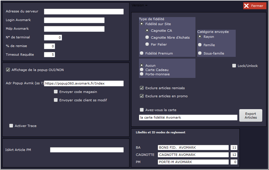 Une fois la fidélité externe activée, la fenêtre de configuration de Avomark apparait :