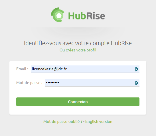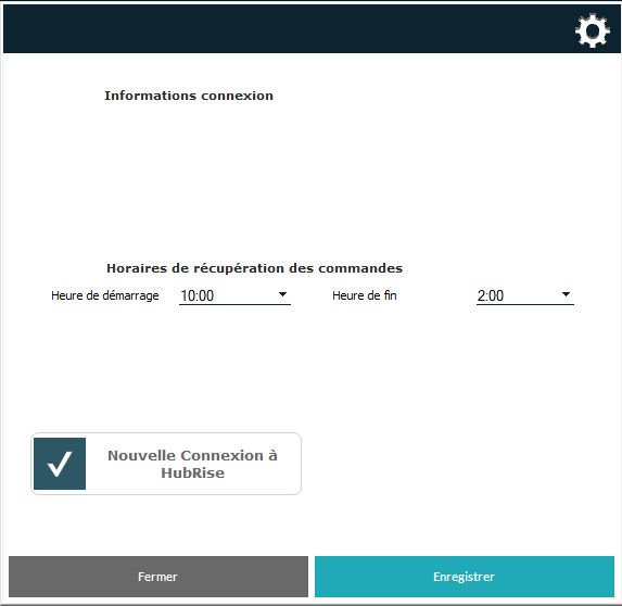 Pour établir la connexion avec les services Hubrise, initiez une 'Nouvelle Connexion à Hubrise" et renseignez les informations d'identification client :