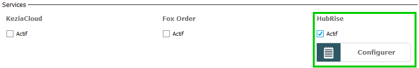 Pour activer la liaison avec Hubrise (Agrégateur de commande) cochez "Actif" sous le service Hubrise :