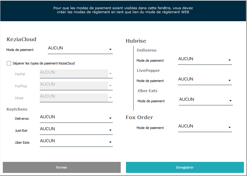 Les moyens de règlements souhaité devront être créé préalablement dans KeziaII.