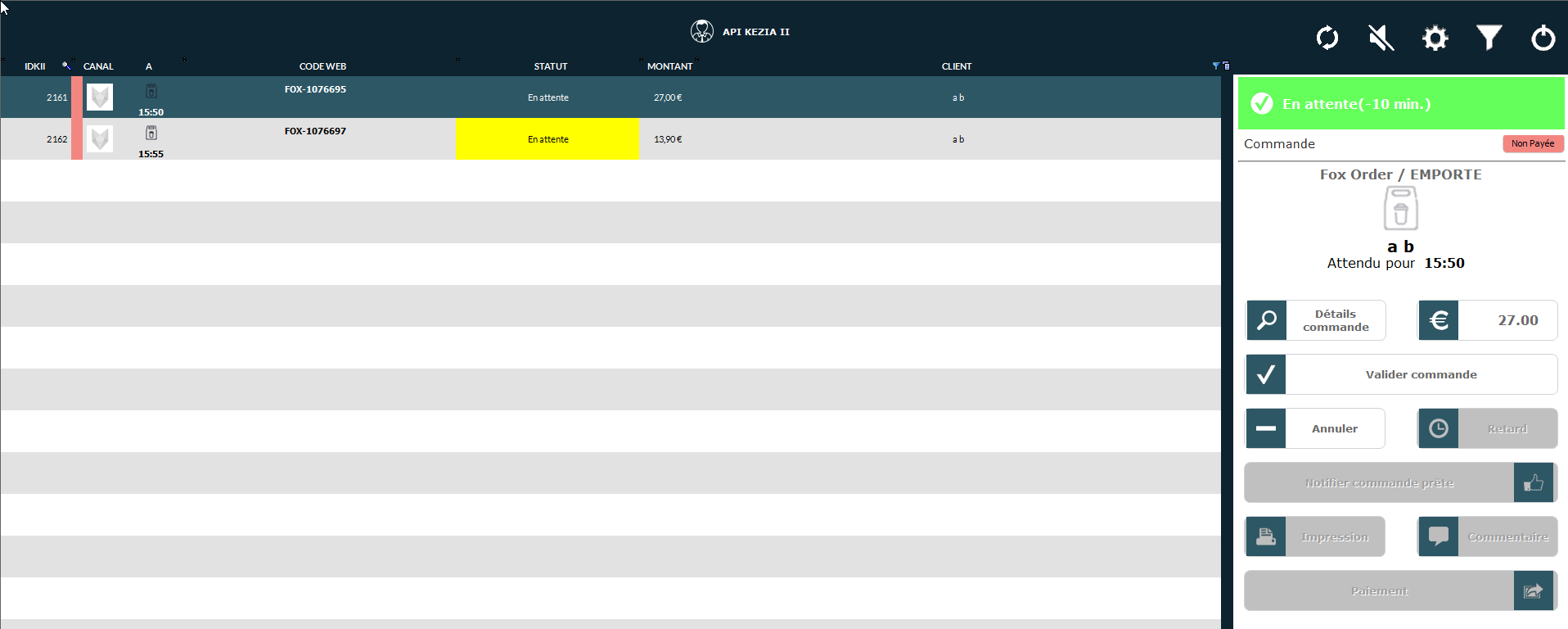Paiement permet de rappeler la commande en caisse pour procéder à son règlement.
