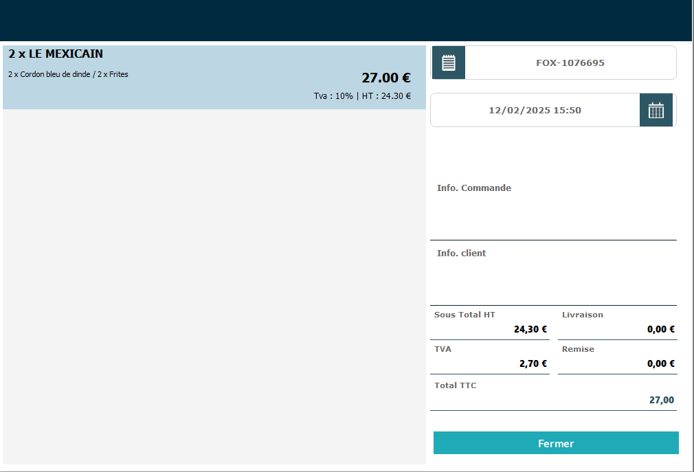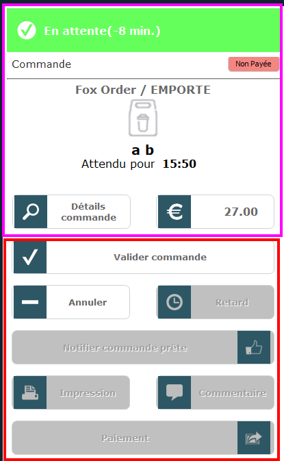 Dans l'encadré rose, vous retrouverez les informations de base de la commande : nom client, date et heure de retrait, montant, détail, origine (FoxOrders, Prestashop, WooCommerce, UberEats, Deliveroo ou Hubrise), type de consommation (sac : emporté, table : sur place, vélo : livraison) et l'état du paiement (Payée ou Non payée).