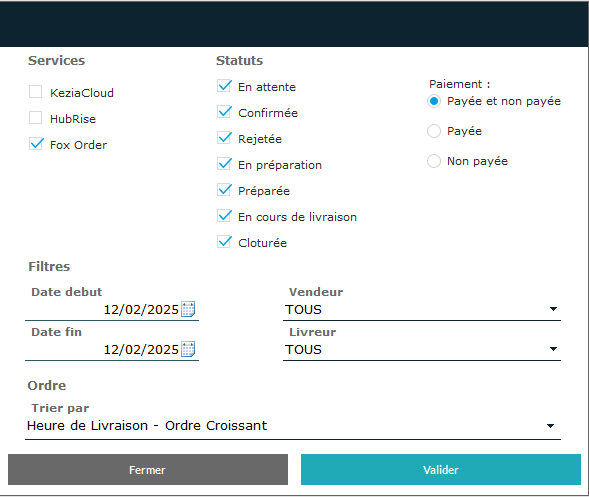Permet d'afficher ou de masquer les commandes suivant le livreur associé.