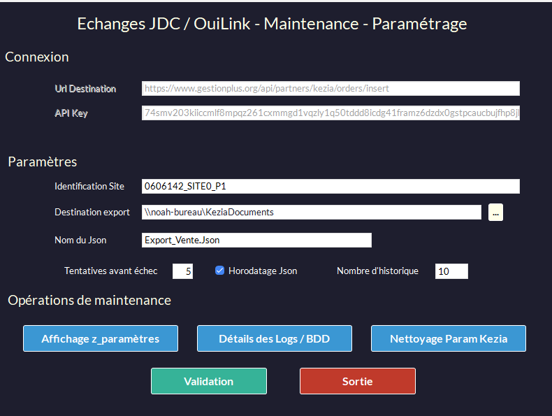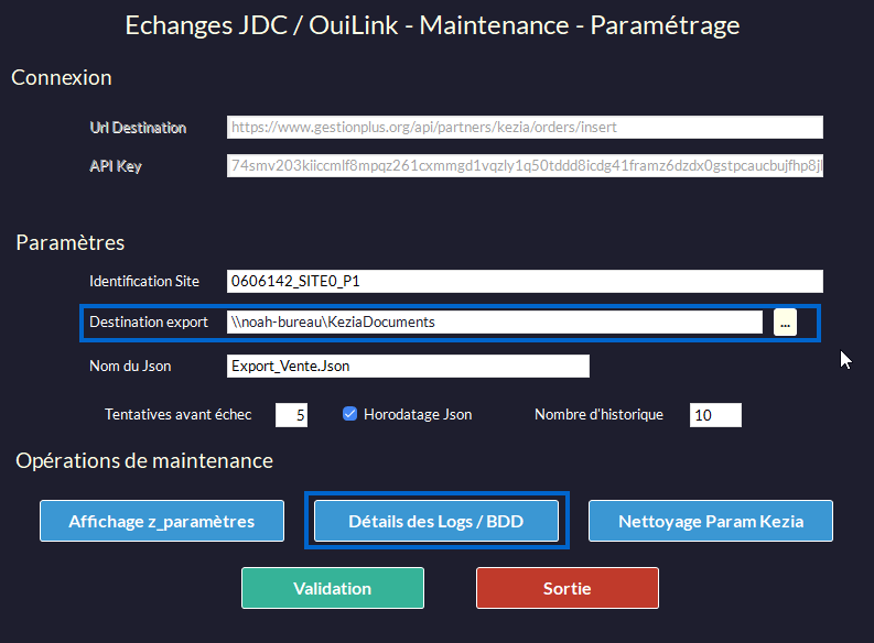 Vous retrouverez les paramètres permettant la modification du dossier de destination de l'export et l'accès au logs (voir les 2 encadrés bleu) :