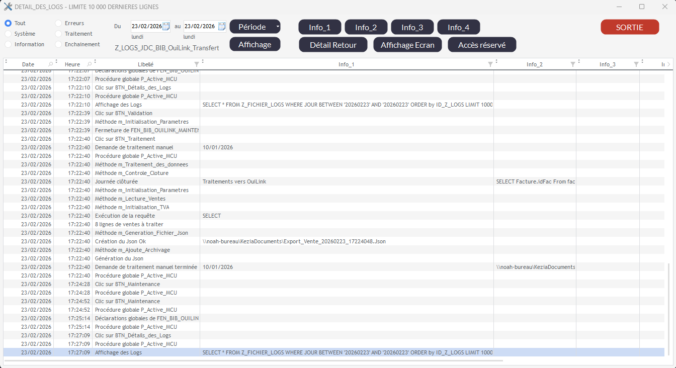 Dans l'onglet des logs, vous retrouverez toutes les actions de la bibliothèque ainsi que le résultat de ses opérations :