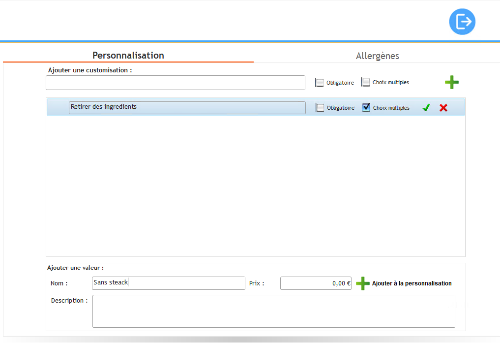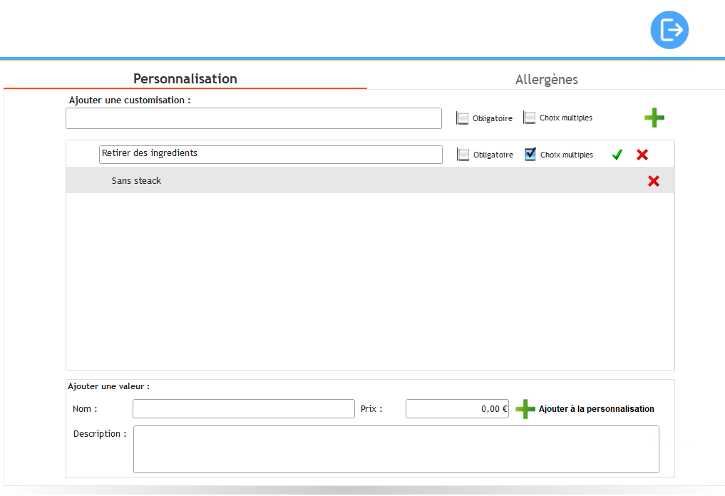 La Valeur "Sans steak" est bien ajoutée à la personnalisation "Retirer des ingredients". Vous pouvez supprimer une Valeur ou même un Personnalisation en cliquant sur le bouton