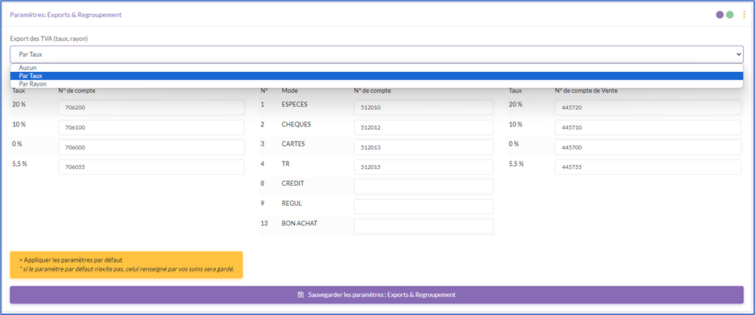 Code de comptabilité utilisé pour les différents Rayons en fonction des TVA.
