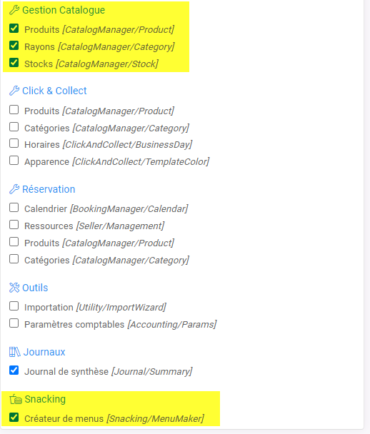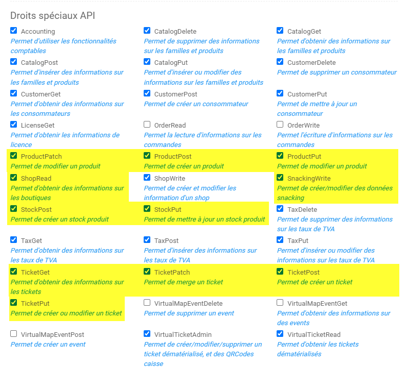 Vous devez cocher ProductPatch, ProductPost, ProductPut, ShopRead, SnackingWrite, StockPost, StockPut, TicketGet, TicketPatch, TicketPost, TicketPut