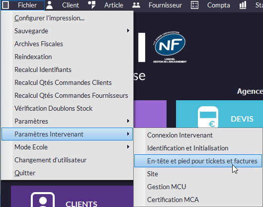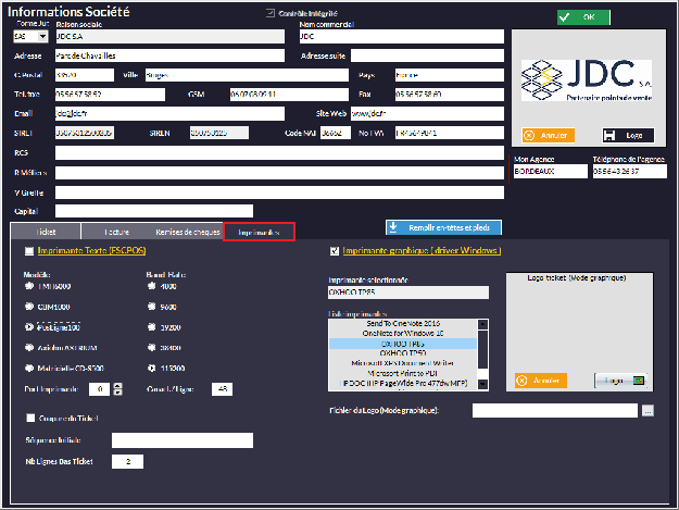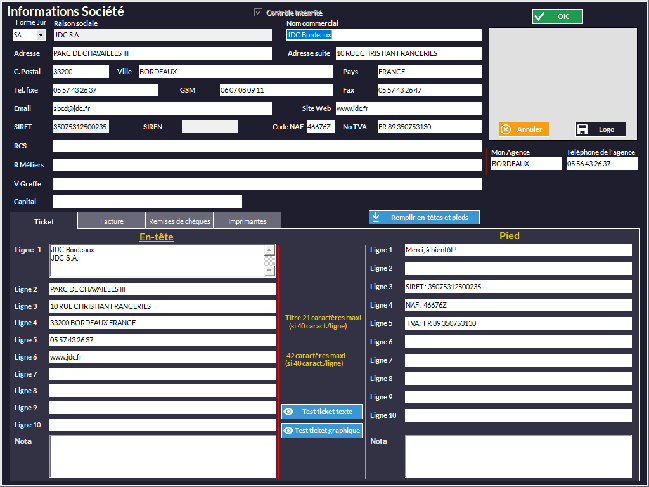 Vous retrouvez ici les coordonnées du client et les informations qui apparaîtront sur l'en-tête et le pied du ticket de caisse.