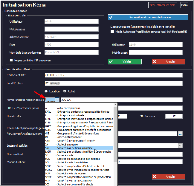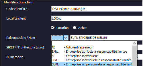 La forme juridique doit être renseignée dans le menu déroulant ET dans le champ Raison Sociale/Nom (elles doivent correspondre) :
