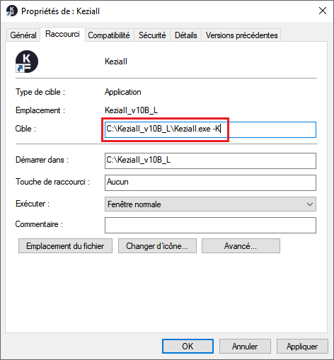 - Dans la fenêtre qui s'ouvre, écrivez à la suite de C:\nomdevotredossier\KeziaII.exe, espace -K dans le champ Cible comme ceci :
