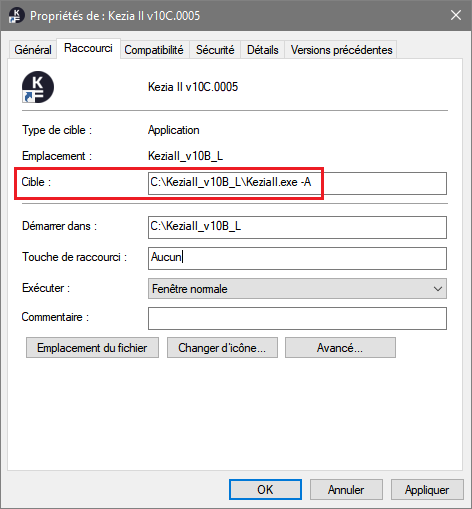 - Il est possible de lancer Kezia II en mode autonome depuis le raccourci en ajoutant l'argument "-A". Il faut faire un clic droit sur le raccourci