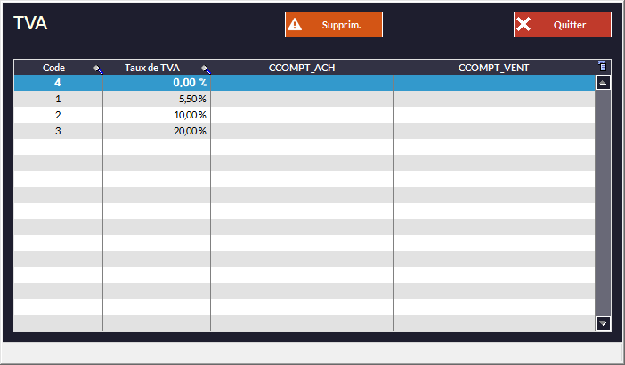 Créez un taux de TVA à 0% (en plus des autres). Pour ce faire, allez sur menu Article -> Outils -> Configuration TVA et double-cliquez dans le champ Taux de TVA pour inscrire les taux qui correspondent à votre activité. Au moindre doute dans cette fenêtre, appelez le support Kezia ou votre Agence. Ne modifiez jamais un taux de TVA existant !