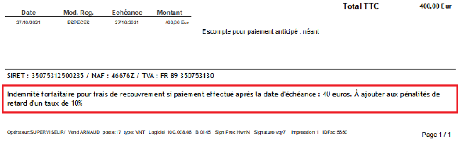 Le champ Mention obligatoire de l'indemnité forfaitaire de recouvrement des personnes morales est à recopier tel quel dans le champ En-tête/Pied Facture pour que la mention apparaisse sur les documents de vente A4 quand elle est faite à une personne morale (case à cocher dans le fiche du client concerné). Vous pouvez modifier le texte mais il faut laisser %pmorale au début.
