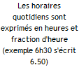 Vous pouvez fixer des horaires quotidiens exprimés en fractions d'heures (1h00 = 1 ; 1h30 = 1,50 ; 1h45 = 1,75...).