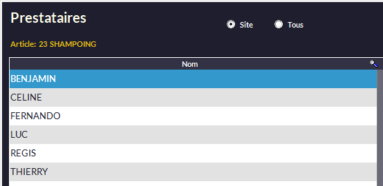 permet de créer un prestataire en remplissant le champ Nom du nouveau prestataire.- Entrez ses initiales directement dans le tableau (utile car elles s'afficheront sur les lignes du ticket de caisse, à côté de la prestation).