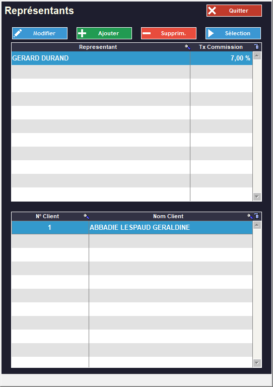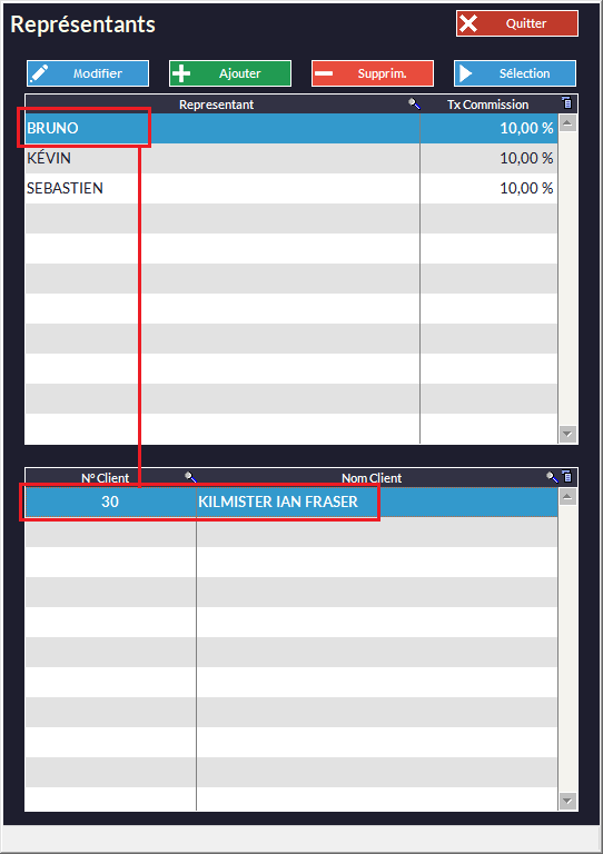- Dans les fiches clients, vous pouvez lier un représentant à un client.