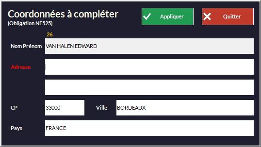 - Entrez la civilité, le nom et le prénom (il est important de respecter cet ordre de manière à vous faciliter les recherches ultérieures) du client puis son adresse et son code postal.
