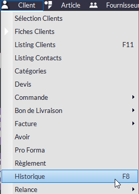 Cette fenêtre vous permet d'accéder à tout l'historique des ventes (devis, commandes, bons de livraison, factures, avoirs, pro forma, notes) et des règlements clients.