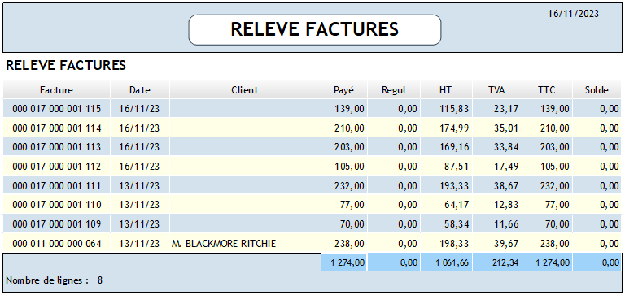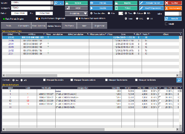 Si vous cliquez une fois dans le tableau du haut, le détail s'affiche en bas (ici, on clique sur la facture 000 004 000 000 006 et le détail s'affiche en dessous : il y a deux lignes de vente).
