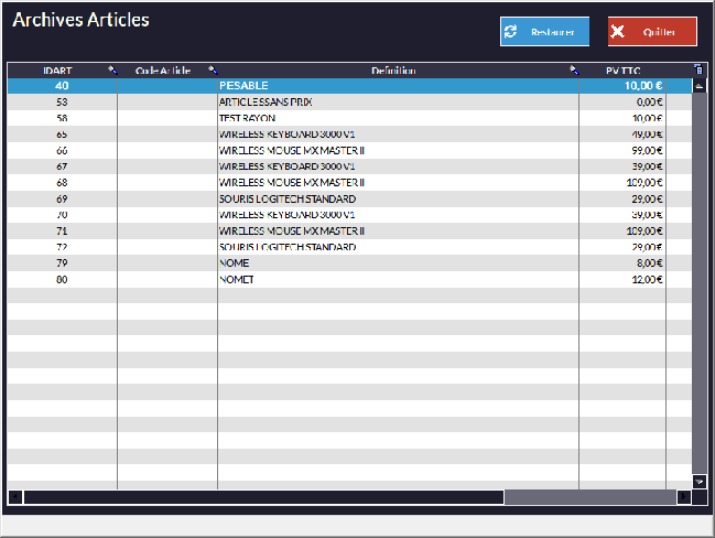 Lorsque vous supprimez un article de votre base Kezia II, il est automatiquement placé dans cette "corbeille" appelée Restauration Articles.