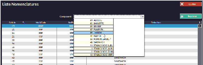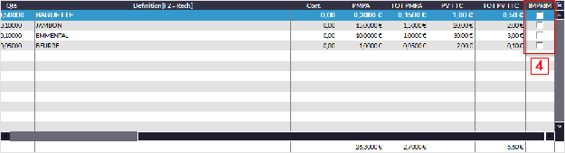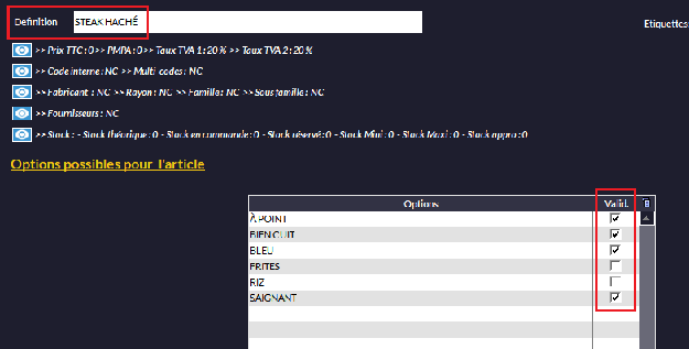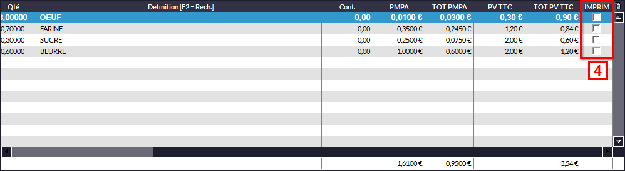 - Option Pas imprimer [dans Menu -> Paramètres] : Cette case s'active lorsque l'on met un prix à zéro avec l'option Prix Nul Autorisé cochée. Elle permet de ne pas afficher l'article sur le ticket de caisse lors d'une vente. Utile par exemple si l'on ne veut pas que les ingrédients apparaissent sur le ticket de caisse afin qu'il ne soit pas trop long.