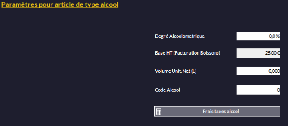 - Sur l'onglet Tarif, renseignez le Degré Alcoolique (ou Titre Alcoométrique Volumique (T.A.V.), le Volume Unit (en litres) et le Code Alcool.