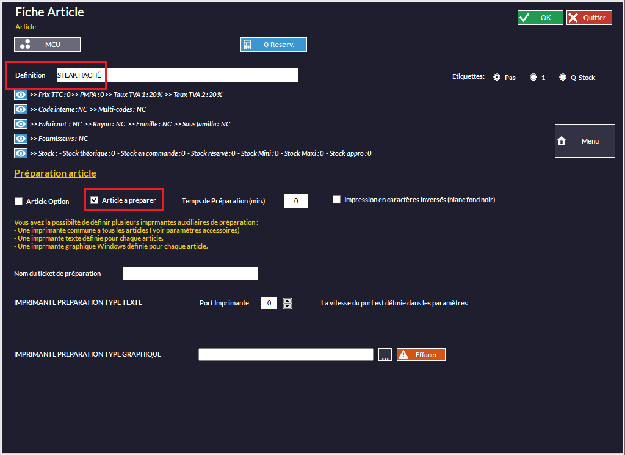 - Le Complément de Définition vous permet d'écrire un texte libre qui sera repris sur les tickets et factures.