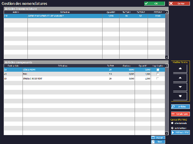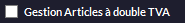 Lorsque l'option double TVA est activée dans les paramètres du logiciel (menu Fichier -> Paramètres -> Configuration -> Article), vous pouvez déterminer le pourcentage HT soumis à la TVA2 (PSTVA2).