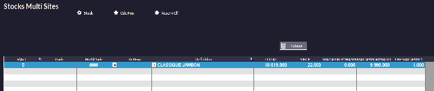 Cette fonction vous permet de consulter l'état du stock pour le produit concerné (ici un sandwich Classique Jambon) sur plusieurs sites (dans le cas où vous avez une configuration Kezia II multisite) :