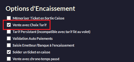 Vous pouvez également autoriser la saisie du prix en caisse (pour des articles avec un prix). Pour ce faire, Allez dans le menu Fichier -> Paramètres -> Configuration -> Saisie en Caisse et activez la/les case(s) appropriée(s) :