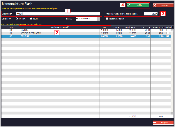 N.B : L'article Rhum des DOM (prix de vente TTC : 1000€) a été préalablement créé (voir le chapitre Gestion des Articles - Création d'un Article).
