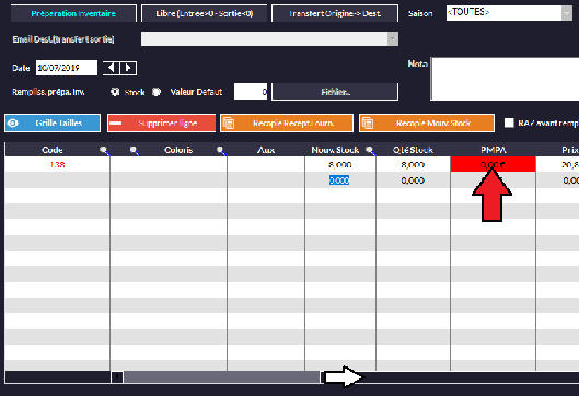 S'il reste des articles ayant un prix d'achat (PMPA) à zéro, un message vous préviendra et les cases PMPA des articles concernés seront rouges :