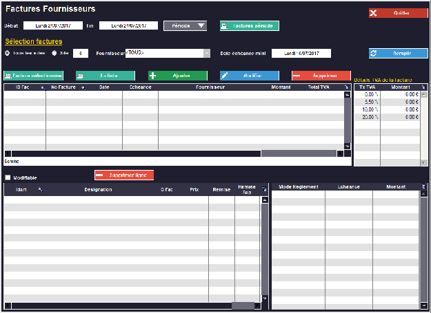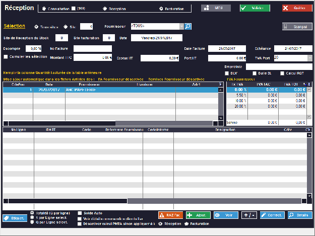 Vous permet de voir un classement par TVA des montants facturés à la réception (en principe TVA FAC = TVA TOT). TVA TOT correspond à ce qui était dans le BL fournisseur et TVA FAC à ce qui a été saisi lors de la facturation. Lors d'un export comptable, c'est TVA FAC qui sera exporté. TVA FAC peut être rectifié s'il y a une différence entre la TVA d'un fournisseur qui serait calculée sur trois décimales et vous sur deux.