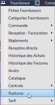 La fenêtre Ruptures dresse la liste d'articles dont le stock est inférieur ou égal au paramètre Qté Mini (+ option Alerte Stock Mini dans F9) de la fiche article (mais seulement si Q_Mini > 0).