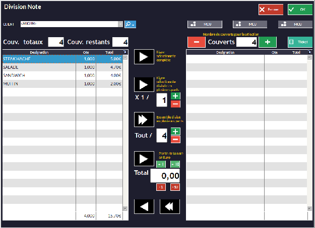 - Le justificatif ne peut être imprimé qu'une fois par ticket. Pour le diviser, il faut passer par Fonctions -> Division Note.
