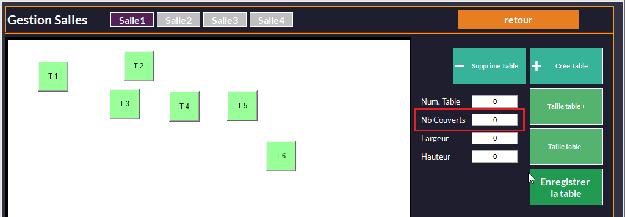 Répétez la procédure de création de tables autant de fois que nécessaire. A chaque création déplacez l'icône de la table de manière à reproduire la disposition réelle de votre salle. Ceci vous facilitera le repérage des tables lors de l'encaissement.