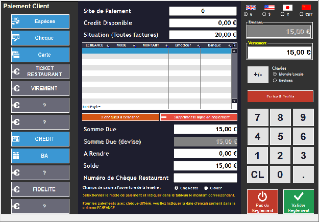 Dans l'onglet Clients, Entrez le nom du mode de règlement (Carte Restaurant par exemple) dans un champ libre de la colonne Modes de Règlement.