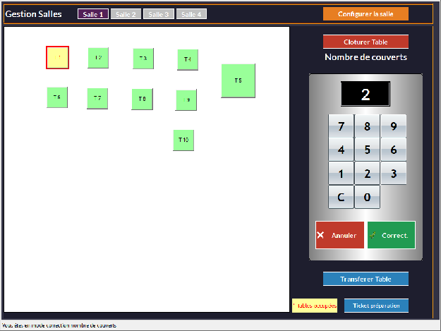 Corriger le nombre de couverts d'une table à l'aide du pavé numérique : appuyer sur