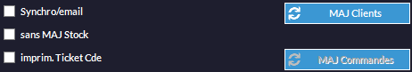 sert à lancer manuellement l'importation des fiches clients du site web vers la base de données. Si le code Web (généré à la première exportation) existe, la fiche sera mise à jour. Sinon la fiche sera créée.  sert à importer manuellement les commandes passées sur le site. Ne peut être activé tant que la mise à jour des fiches clients n'a pas été faite.