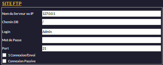 Renseignez ici les champs avec les identifiants donnant l'accès au serveur FTP. Chemin DB est le chemin du dossier contenant les images des articles. Connexion Passive active le mode de connexion passif au FTP (recommandé).