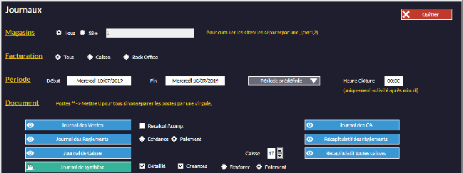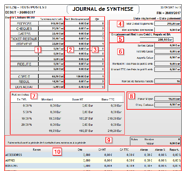 Le journal de synthèse présente les résultats de votre activité sur une période donnée. Vous y trouverez les encaissements (regroupés par mode de règlement), les mouvements de caisse, le récapitulatif du chiffre par TVA et, si nécessaire, le détail des ventes regroupées par rayons.
