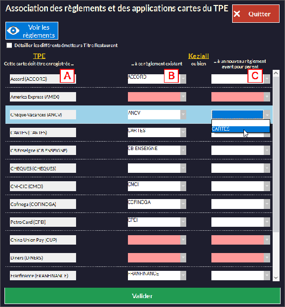 La colonne C permet de créer un mode de la colonne A qui n'existe pas dans Kezia II (colonne B). Par exemple ANCV : vous allez dans la colonne C, vous choisissez à quel mode de règlement "parent" il sera rattaché (Cartes par exemple) et il sera disponible dans la colonne B. Ce mode nouvellement créé ("enfant") sera rattaché au mode général que vous aurez choisi.