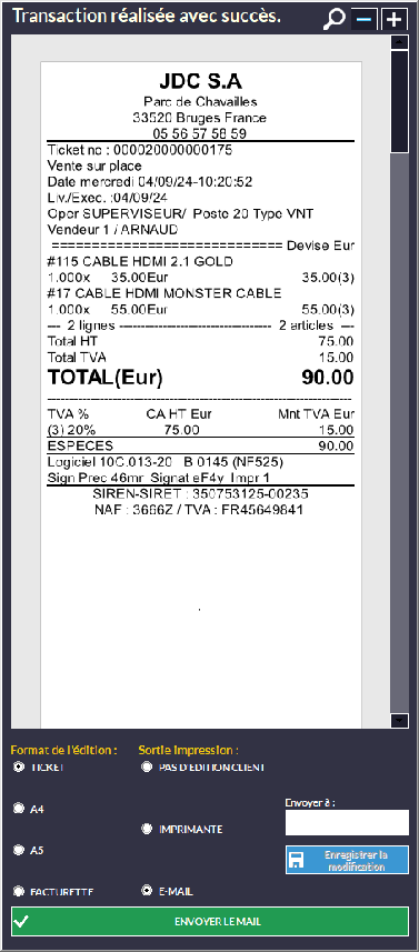 Pour les éditions A4, ça ne change rien : ticket CB imprimé à la validation du règlement TPE (aperçu A4 après validation de la vente).