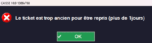Un délai de reprise peut être paramétré pour les retours bipés sur les tickets ayant ce code-barres. Dans notre exemple (1 jour) si le client présente son ticket deux jours après, lorsque vous le biperez en caisse, un message vous avertira que le ticket est trop ancien pour être repris :