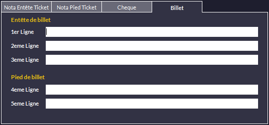 - Billet : renseignez les lignes que vous souhaitez voir imprimées sur le billet de caisse (Ticket en plus du ticket de caisse). Vous devrez activer l'option Billet dans les fiches des articles concernées. Consultez le chapitre Gestion d'Articles - Options Avancées - Tarifs, Paramètres et Multicodes pour plus d'informations.
