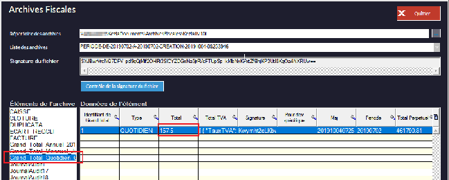 Cette fenêtre vous permet de visualiser les archives fiscales générées par Kezia II et de voir les clôtures (rubriques "Grands Totaux") :