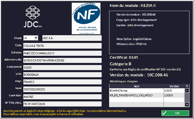 Affiche la version de Kezia II, des informations techniques et le nom et code client.
