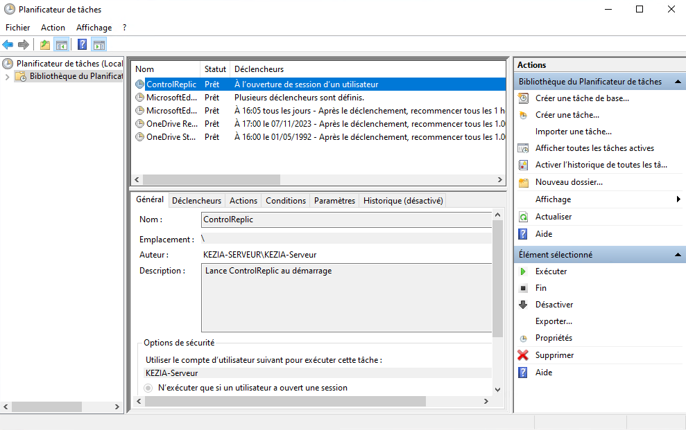 - Créez une tâche planifiée afin de lancer automatiquement ControlReplic à l’ouverture de session Windows :
