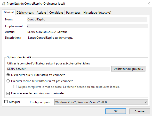 - Créez une tâche planifiée afin de lancer automatiquement ControlReplic à l’ouverture de session Windows :